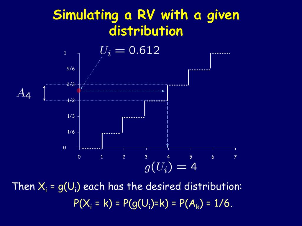 Simulating a RV with a given distribution Then Xi = g(Ui) each has the desired distribution: P(Xi = k) = P(g(Ui)=k) = P(Ak) = 1/6.