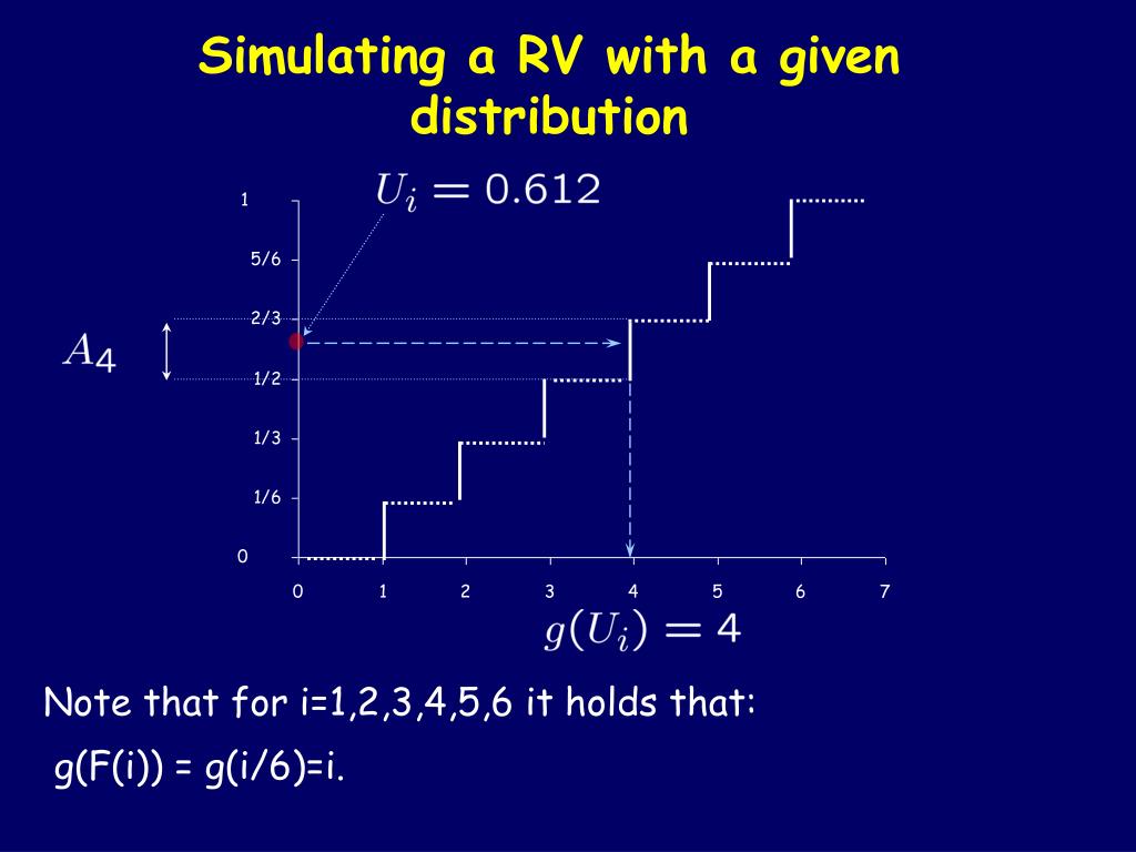 Simulating a RV with a given distribution Note that for i=1,2,3,4,5,6 it holds that: g(F(i)) = g(i/6)=i.