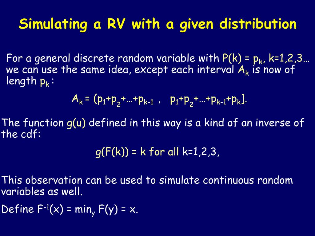 Simulating a RV with a given distribution For a general discrete random variable with P(k) = pk, k=1,2,3… we can use the same idea, except each interval Ak is now of length pk : Ak = (p1+p2+…+pk-1 , p1+p2+…+pk-1+pk]. The function g(u) defined in this way is a kind of an inverse of the cdf: g(F(k)) = k for all k=1,2,3, This observation can be used to simulate continuous random variables as well. Define F-1(x) = miny F(y) = x.