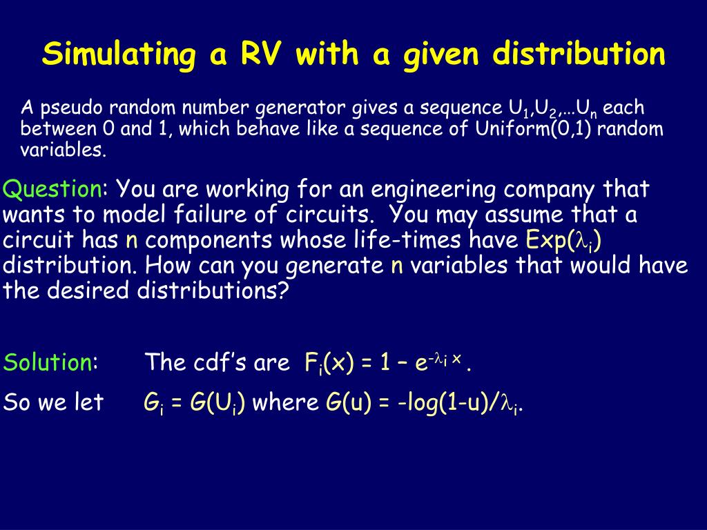Simulating a RV with a given distribution A pseudo random number generator gives a sequence U1,U2,…Un each between 0 and 1, which behave like a sequence of Uniform(0,1) random variables. Question: You are working for an engineering company that wants to model failure of circuits. You may assume that a circuit has n components whose life-times have Exp(li) distribution. How can you generate n variables that would have the desired distributions? Solution: The cdf’s are Fi(x) = 1 – e-li x . So we let Gi = G(Ui) where G(u) = -log(1-u)/li.
