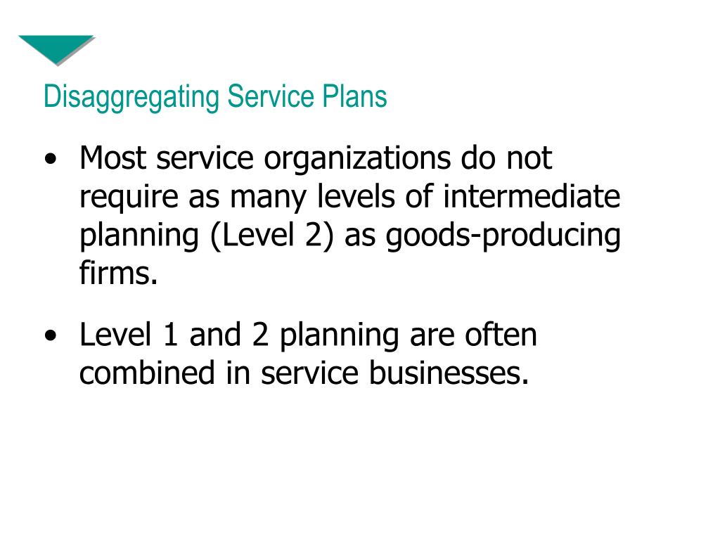 Disaggregating Service Plans • Most service organizations do not require as many levels of intermediate planning (Level 2) as goods-producing firms. • Level 1 and 2 planning are often combined in service businesses.