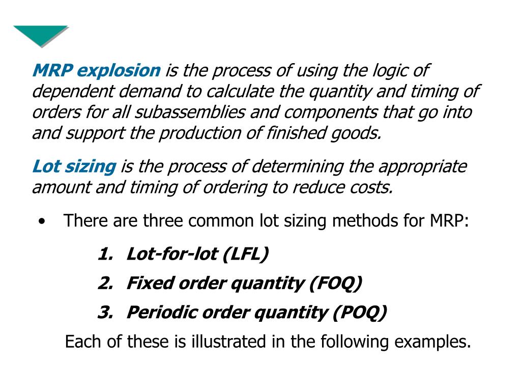 MRP explosionis the process of using the logic of dependent demand to calculate the quantity and timing of orders for all subassemblies and components that go into and support the production of finished goods. • Lot sizingis the process of determining the appropriate amount and timing of ordering to reduce costs. • There are three common lot sizing methods for MRP: • Lot-for-lot (LFL) • Fixed order quantity (FOQ) • Periodic order quantity (POQ) • Each of these is illustrated in the following examples.