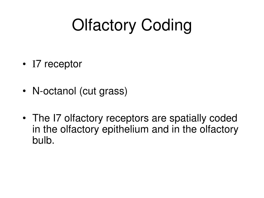 Olfactory Coding • I7 receptor • N-octanol (cut grass) • The I7 olfactory receptors are spatially coded in the olfactory epithelium and in the olfactory bulb.