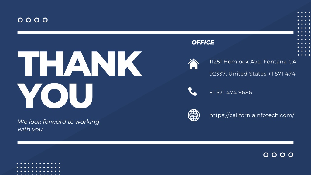 OFFICE THANK YOU We look forward to working with you 11251 Hemlock Ave, Fontana CA 92337, United States +1 571 474 +1 571 474 9686 https://californiainfotech.com/