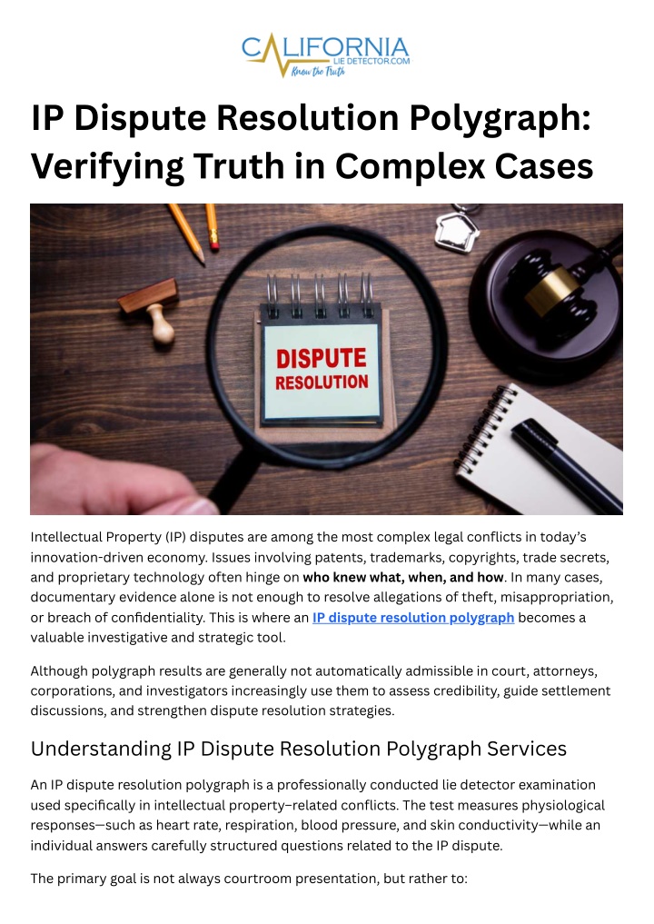 Faster internal investigations Protection of proprietary assets Reduced legal costs Clearer accountability Value in Mediation & Arbitration In alternative dispute resolution, polygraph results can influence settlement discussions and promote transparency without formal courtroom proceedings. Polygraph vs Other Truth Verification Tools in IP Disputes While tools like forensic audits, digital tracking, and expert testimony are essential, they may not address intent or knowledge. An IP dispute resolution polygraph fills this gap by focusing on credibility and deception related to specific allegations. Many legal teams use polygraph testing alongside: Digital forensics Document review Expert analysis Witness interviews This multi-layered approach strengthens overall dispute resolution strategy. Choosing the Right IP Polygraph Provider Accuracy, confidentiality, and legal awareness are critical. Attorneys and companies should select providers who: Follow American Polygraph Association (APA) standards Have experience with complex legal disputes Provide clear, unbiased reporting Understand IP law sensitivities California Lie Detector is a trusted company offering professional IP dispute resolution polygraph services across California. Their certified examiners work closely with attorneys, corporations, and legal teams to ensure ethical, confidential, and legally compliant testing tailored to intellectual property disputes. Ethical Importance of Polygraph Use in IP Cases Polygraph testing must never be coercive or misleading. Ethical use includes: Full informed consent Clear explanation of limitations Neutral question design