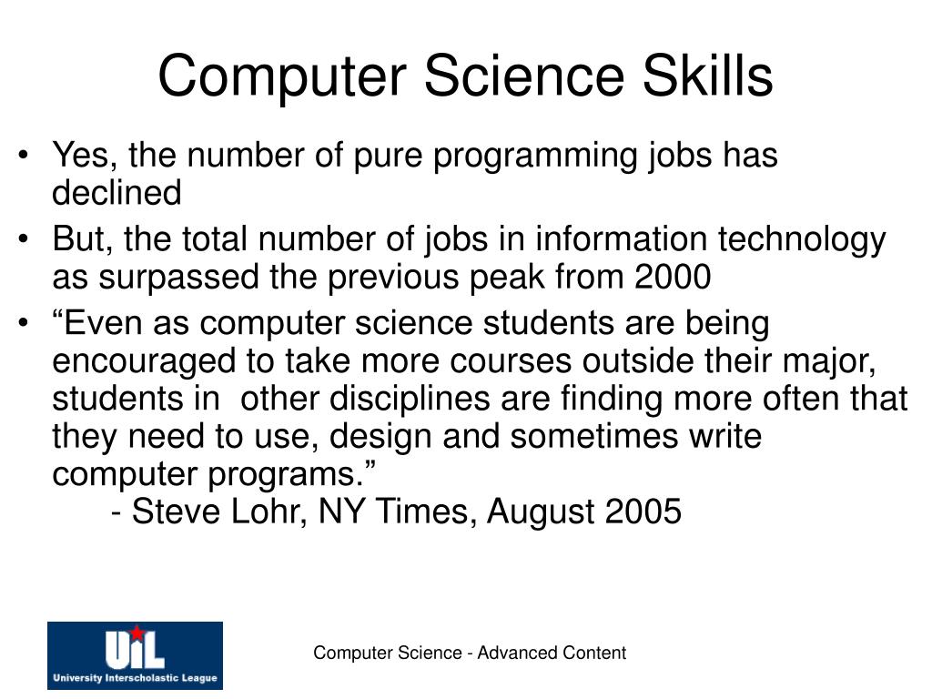 Computer Science Skills • Yes, the number of pure programming jobs has declined • But, the total number of jobs in information technology as surpassed the previous peak from 2000 • “Even as computer science students are being encouraged to take more courses outside their major, students in other disciplines are finding more often that they need to use, design and sometimes write computer programs.” - Steve Lohr, NY Times, August 2005 Computer Science - Advanced Content
