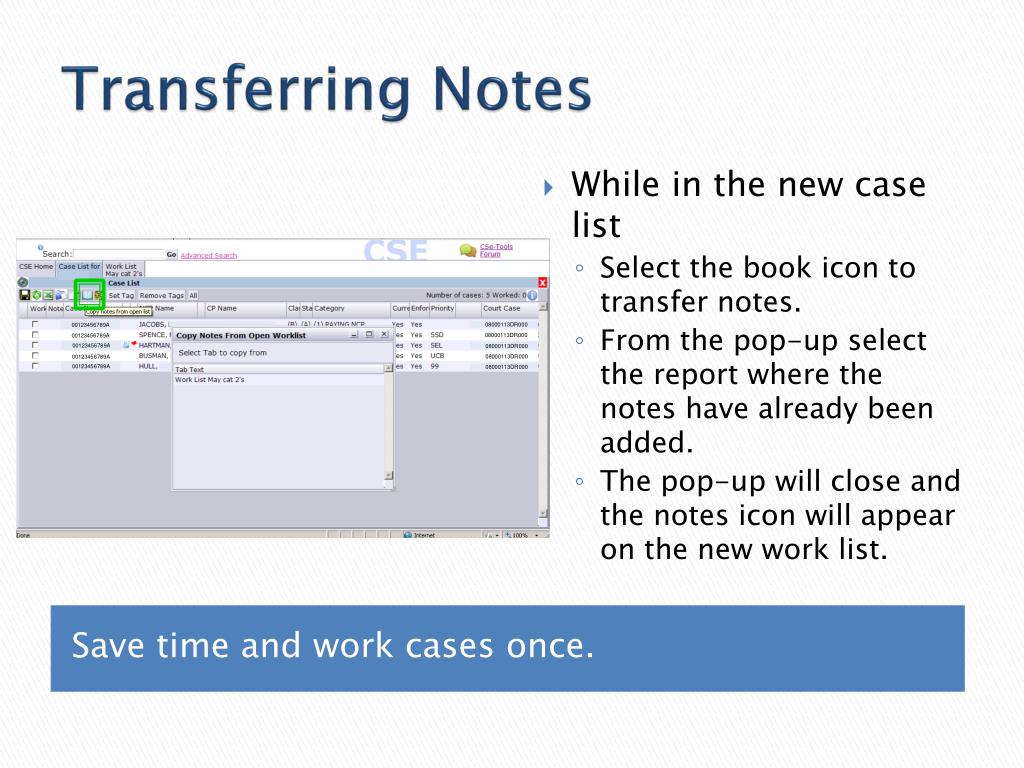 Transferring Notes • While in the new case list • Select the book icon to transfer notes. • From the pop-up select the report where the notes have already been added. • The pop-up will close and the notes icon will appear on the new work list. 00123456789A 08000113DR000 00123456789A 08000113DR000 00123456789A 08000113DR000 00123456789A 08000113DR000 00123456789A 08000113DR000 Save time and work cases once.