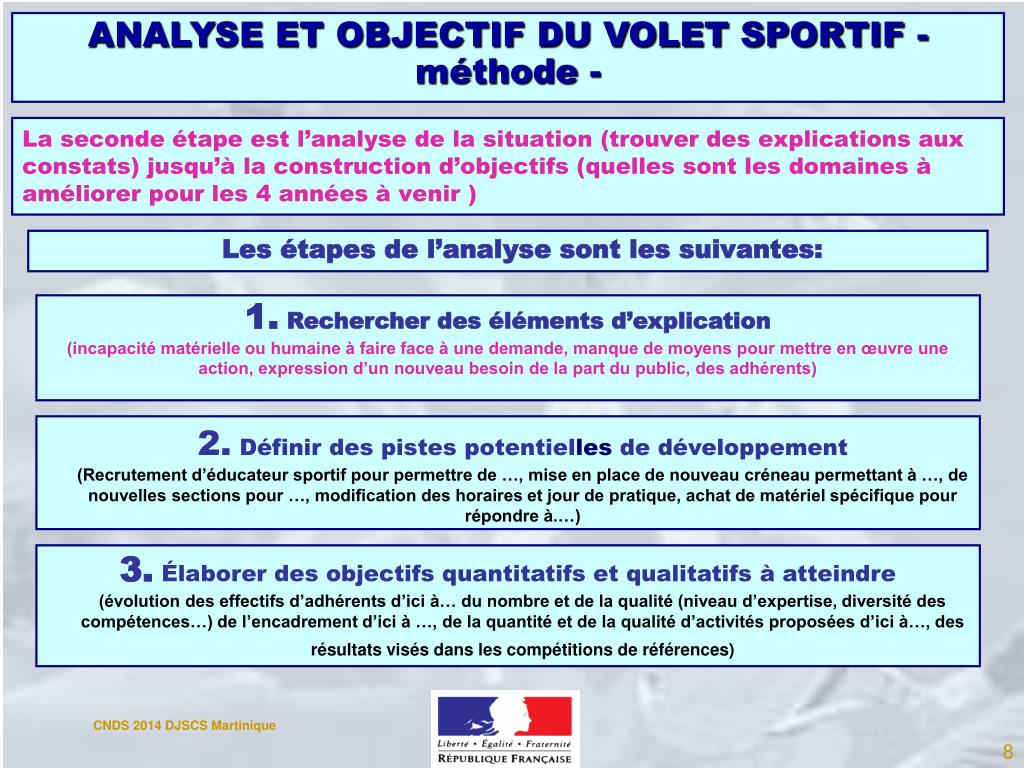 La seconde étape est l’analyse de la situation (trouver des explications aux constats) jusqu’à la construction d’objectifs (quelles sont les domaines à améliorer pour les 4 années à venir ) ANALYSE ET OBJECTIF DU VOLET SPORTIF - méthode - Les étapes de l’analyse sont les suivantes: 1. Rechercher des éléments d’explication(incapacité matérielle ou humaine à faire face à une demande, manque de moyens pour mettre en œuvre une action, expression d’un nouveau besoin de la part du public, des adhérents) 2. Définir des pistes potentielles de développement(Recrutement d’éducateur sportif pour permettre de …, mise en place de nouveau créneau permettant à …, de nouvelles sections pour …, modification des horaires et jour de pratique, achat de matériel spécifique pour répondre à.…) 3.Élaborer des objectifs quantitatifs et qualitatifs à atteindre(évolution des effectifs d’adhérents d’ici à… du nombre et de la qualité (niveau d’expertise, diversité des compétences…) de l’encadrement d’ici à …, de la quantité et de la qualité d’activités proposées d’ici à…, des résultats visés dans les compétitions de références) CNDS 2014 DJSCS Martinique