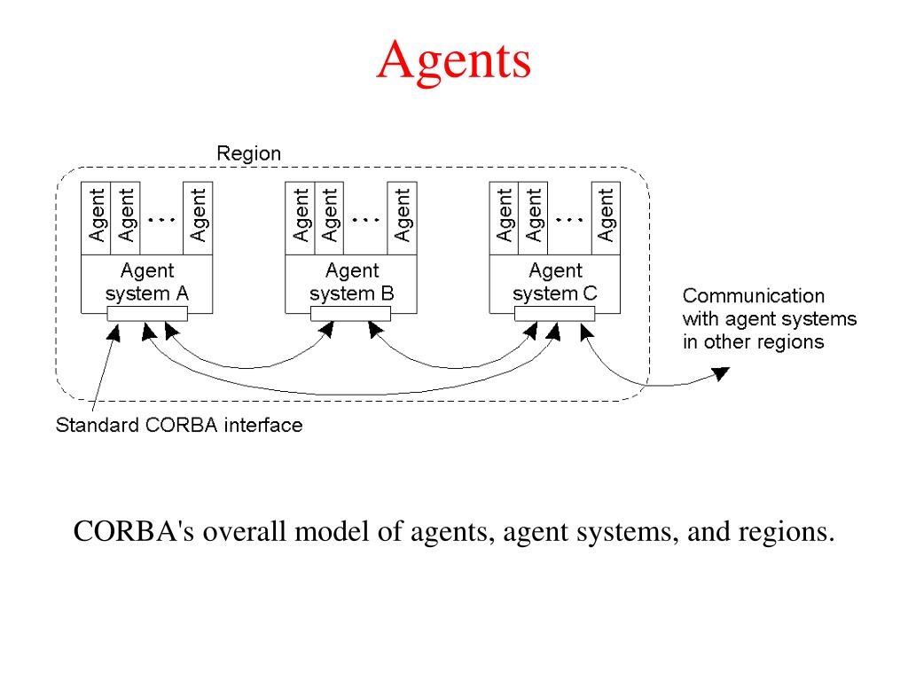 Agents • CORBA's overall model of agents, agent systems, and regions.