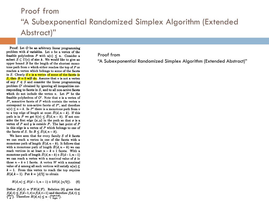 Proof from “A Subexponential Randomized Simplex Algorithm (Extended Abstract)” • Proof from • “A Subexponential Randomized Simplex Algorithm (Extended Abstract)”