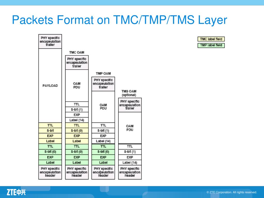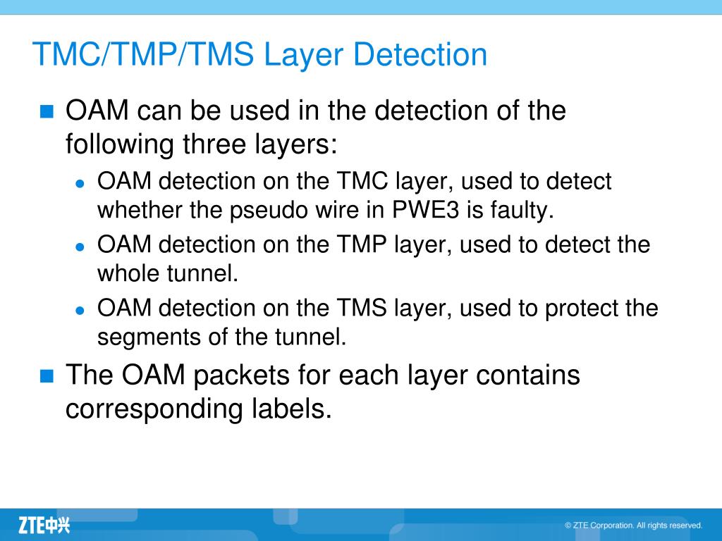 TMC/TMP/TMS Layer Detection OAM can be used in the detection of the following three layers: OAM detection on the TMC layer, used to detect whether the pseudo wire in PWE3 is faulty. OAM detection on the TMP layer, used to detect the whole tunnel. OAM detection on the TMS layer, used to protect the segments of the tunnel. The OAM packets for each layer contains corresponding labels.