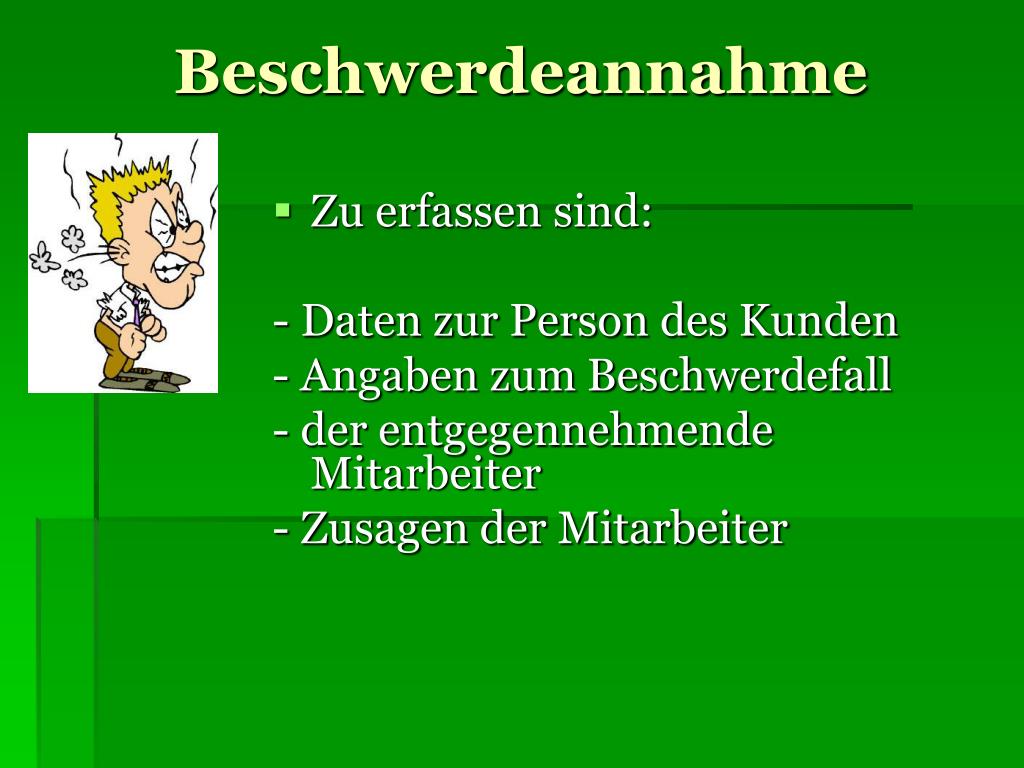 Beschwerdeannahme • Zu erfassen sind: - Daten zur Person des Kunden - Angaben zum Beschwerdefall - der entgegennehmende Mitarbeiter - Zusagen der Mitarbeiter