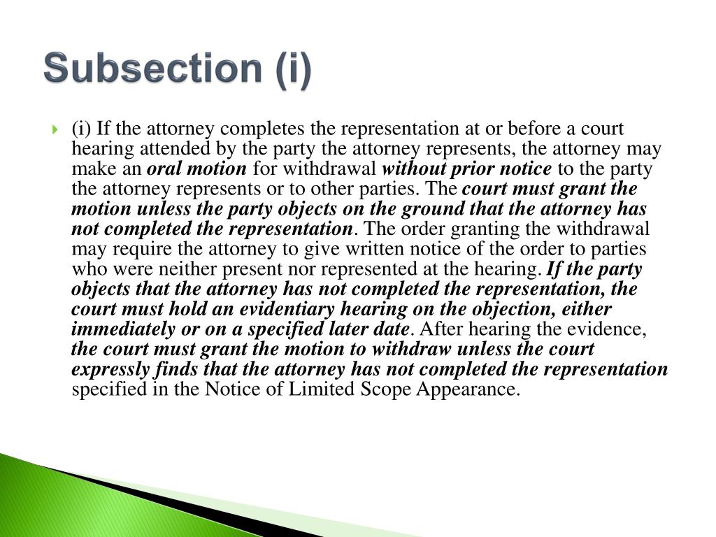 Subsection (i) • (i) If the attorney completes the representation at or before a court hearing attended by the party the attorney represents, the attorney may make an oral motion for withdrawal without prior notice to the party the attorney represents or to other parties. The court must grant the motion unless the party objects on the ground that the attorney has not completed the representation. The order granting the withdrawal may require the attorney to give written notice of the order to parties who were neither present nor represented at the hearing. If the party objects that the attorney has not completed the representation, the court must hold an evidentiary hearing on the objection, either immediately or on a specified later date. After hearing the evidence, the court must grant the motion to withdraw unless the court expressly finds that the attorney has not completed the representation specified in the Notice of Limited Scope Appearance.