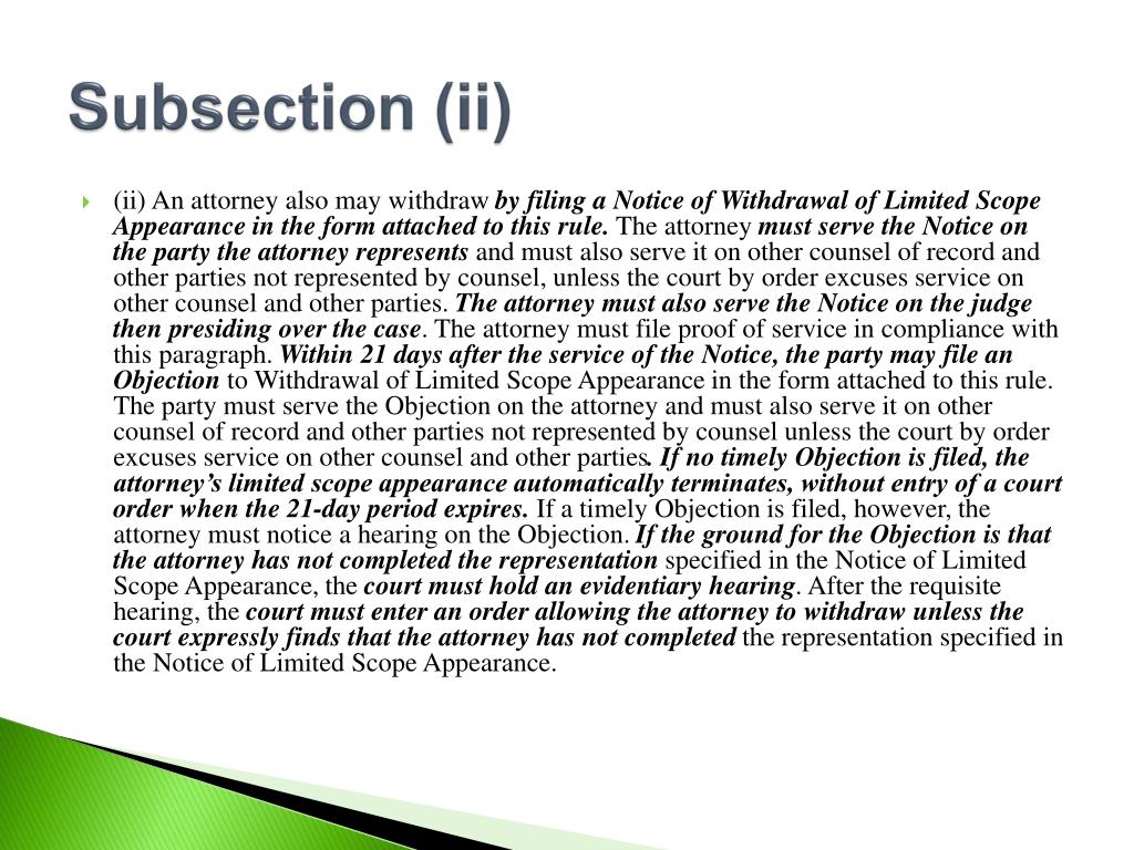 Subsection (ii) • (ii) An attorney also may withdraw by filing a Notice of Withdrawal of Limited Scope Appearance in the form attached to this rule. The attorney must serve the Notice on the party the attorney represents and must also serve it on other counsel of record and other parties not represented by counsel, unless the court by order excuses service on other counsel and other parties. The attorney must also serve the Notice on the judge then presiding over the case. The attorney must file proof of service in compliance with this paragraph. Within 21 days after the service of the Notice, the party may file an Objection to Withdrawal of Limited Scope Appearance in the form attached to this rule. The party must serve the Objection on the attorney and must also serve it on other counsel of record and other parties not represented by counsel unless the court by order excuses service on other counsel and other parties. If no timely Objection is filed, the attorney’s limited scope appearance automatically terminates, without entry of a court order when the 21-day period expires. If a timely Objection is filed, however, the attorney must notice a hearing on the Objection. If the ground for the Objection is that the attorney has not completed the representation specified in the Notice of Limited Scope Appearance, the court must hold an evidentiary hearing. After the requisite hearing, the court must enter an order allowing the attorney to withdraw unless the court expressly finds that the attorney has not completed the representation specified in the Notice of Limited Scope Appearance.