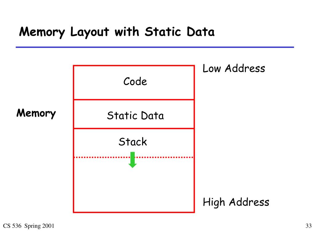 Low Address Code Memory Static Data Stack High Address Memory Layout with Static Data CS 536 Spring 2001
