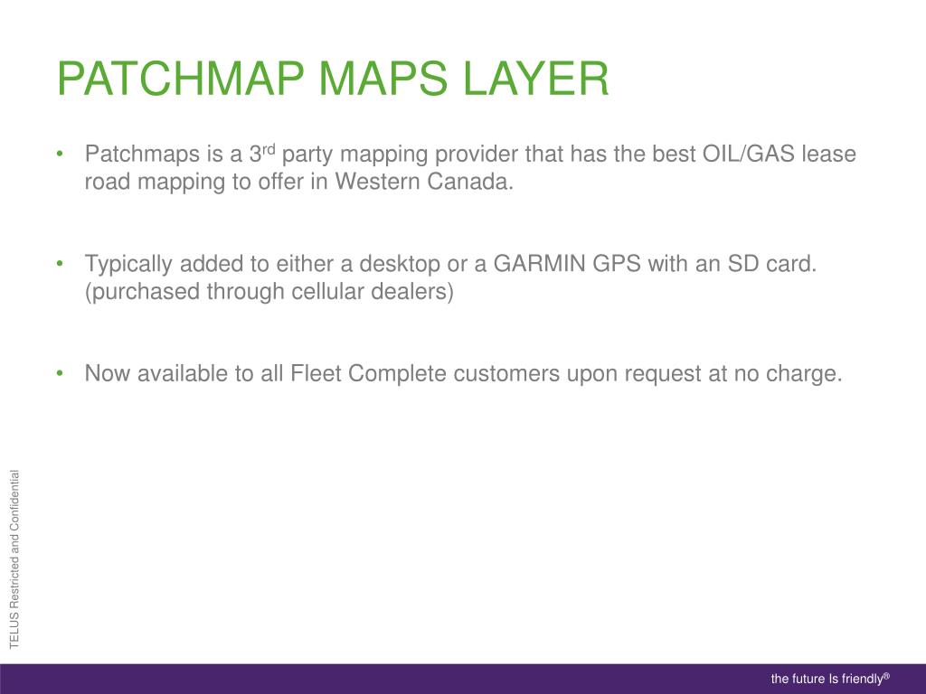 Patchmap Maps layer Patchmaps is a 3rd party mapping provider that has the best OIL/GAS lease road mapping to offer in Western Canada. Typically added to either a desktop or a GARMIN GPS with an SD card. (purchased through cellular dealers) Now available to all Fleet Complete customers upon request at no charge.