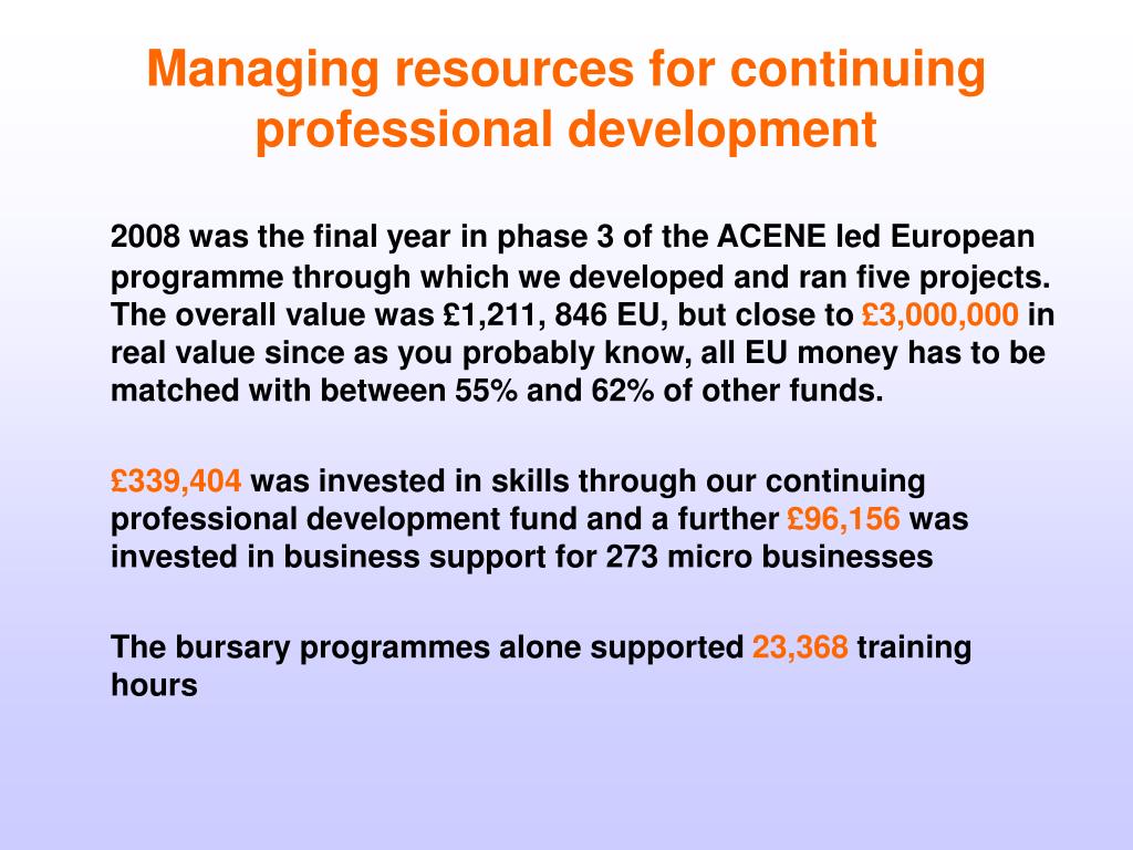 Managing resources for continuing professional development 2008 was the final year in phase 3 of the ACENE led European programme through which we developed and ran five projects. The overall value was £1,211, 846 EU, but close to £3,000,000 in real value since as you probably know, all EU money has to be matched with between 55% and 62% of other funds. £339,404 was invested in skills through our continuing professional development fund and a further £96,156 was invested in business support for 273 micro businesses The bursary programmes alone supported 23,368 training hours