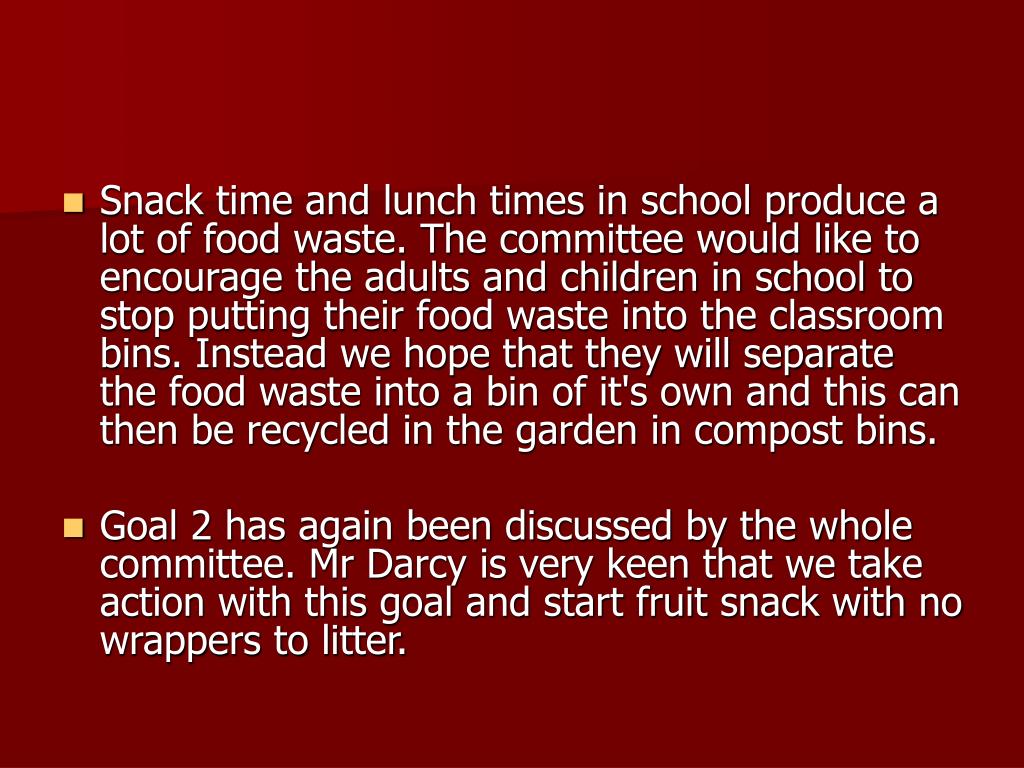 Snack time and lunch times in school produce a lot of food waste. The committee would like to encourage the adults and children in school to stop putting their food waste into the classroom bins. Instead we hope that they will separate the food waste into a bin of it's own and this can then be recycled in the garden in compost bins. • Goal 2 has again been discussed by the whole committee. Mr Darcy is very keen that we take action with this goal and start fruit snack with no wrappers to litter.