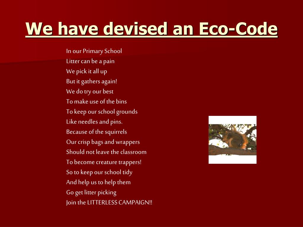 We have devised an Eco-Code In our Primary School Litter can be a pain We pick it all up But it gathers again! We do try our best To make use of the bins To keep our school grounds Like needles and pins. Because of the squirrels Our crisp bags and wrappers Should not leave the classroom To become creature trappers! So to keep our school tidy And help us to help them Go get litter picking Join the LITTERLESS CAMPAIGN!!