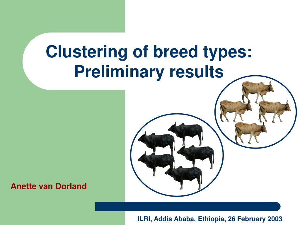 Clustering of breed types : Preliminary results. Anette van Dorland. ILRI, Addis Ababa, Ethiopia, 26 February 2003. Introduction. 1. Large number of unknown breed types: How different/similar are these breed types from each other ? 2. Farmers knowledge versus enumerator observation.