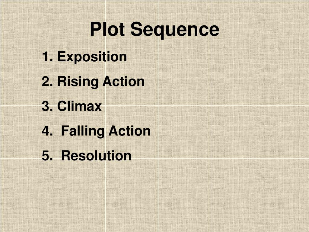 Plot Sequence 1. Exposition 2. Rising Action 3. Climax 4. Falling Action 5. Resolution