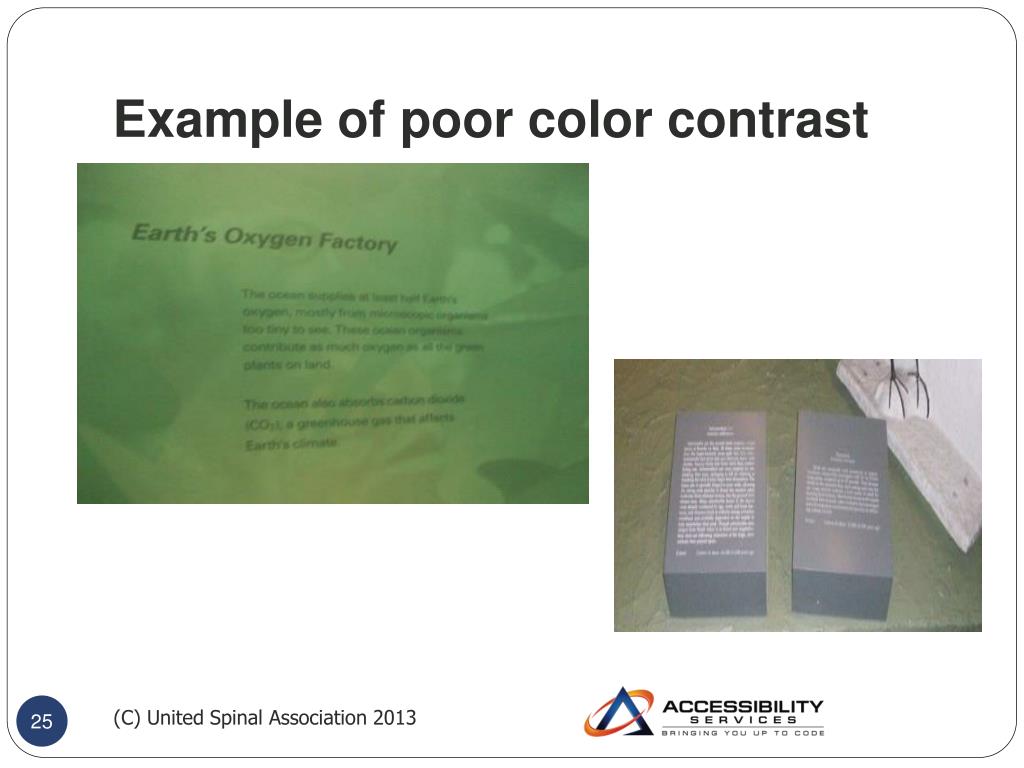 Display Labels • Characters and their background shall have a non-glare finish. • Characters shall contrast with their background with either light characters on a dark background or dark characters on a light background. • Additional factors affecting the ease with which the text can be distinguished from its background include shadows cast by lighting sources, surface glare, and the uniformity of the text and its background colors and textures. (C) United Spinal Association 2013