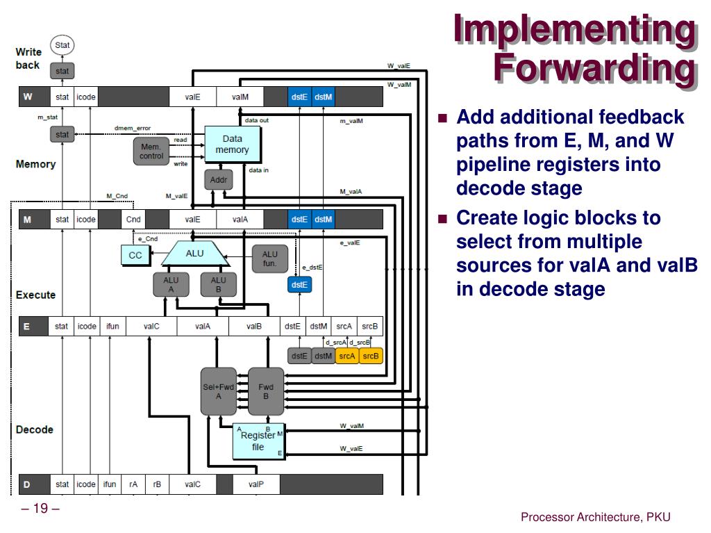 Implementing Forwarding ## What should be the A value? intnew_E_valA = [ # Use incremented PC D_icode in { ICALL, IJXX } : D_valP; # Forward valE from execute d_srcA == e_dstE: e_valE; # Forward valM from memory d_srcA == M_dstM : m_valM; # Forward valE from memory d_srcA == M_dstE : M_valE; # Forward valM from write back d_srcA == W_dstM : W_valM; # Forward valE from write back d_srcA == W_dstE : W_valE; # Use value read from register file 1 : d_rvalA; ];