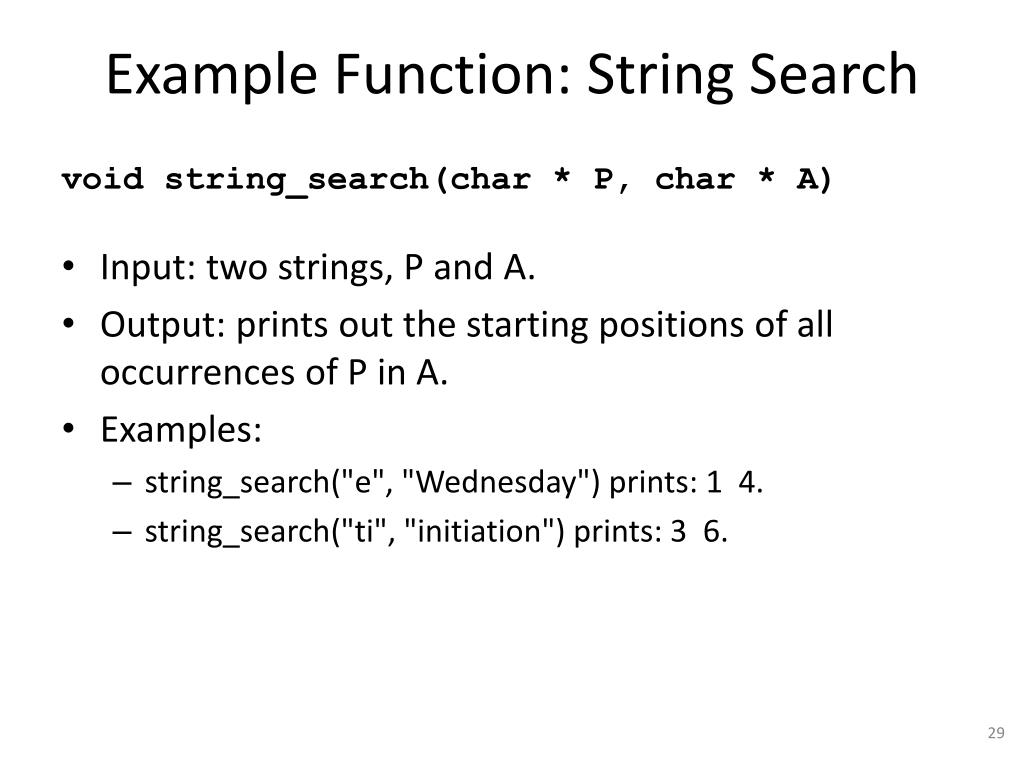 Example Function: String Search void string_search(char * P, char * A) • Input: two strings, P and A. • Output: prints out the starting positions of all occurrences of P in A. • Examples: • string_search("e", "Wednesday") prints: 1 4. • string_search("ti", "initiation") prints: 3 6.
