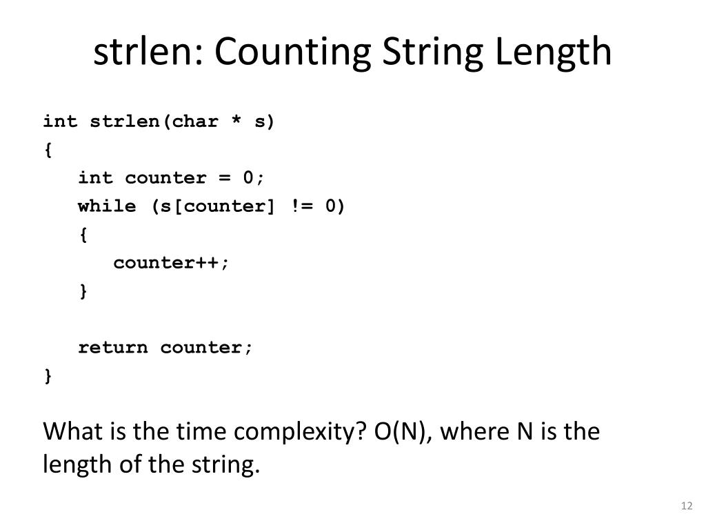 strlen: Counting String Length intstrlen(char * s) { int counter = 0; while (s[counter] != 0) { counter++; } return counter; } What is the time complexity? O(N), where N is the length of the string.