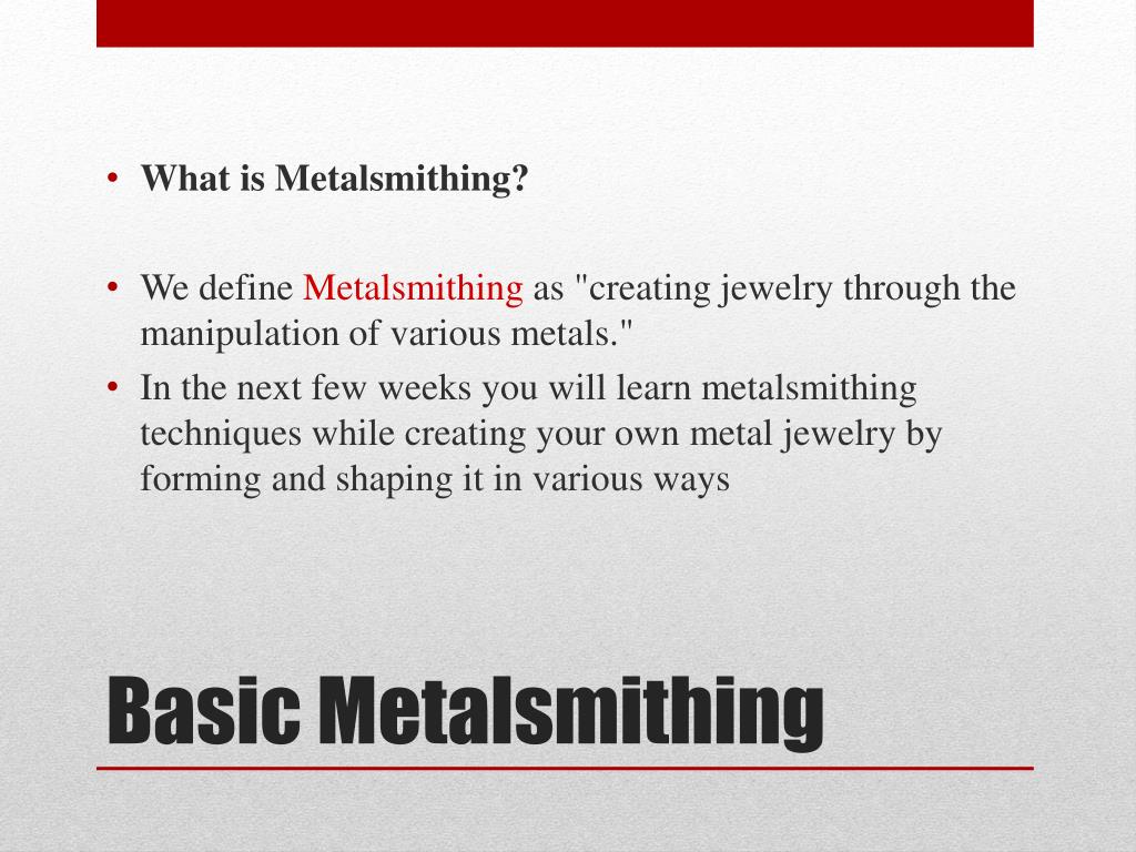 What is Metalsmithing? • We define Metalsmithing as "creating jewelry through the manipulation of various metals." • In the next few weeks you will learn metalsmithing techniques while creating your own metal jewelry by forming and shaping it in various ways Basic Metalsmithing