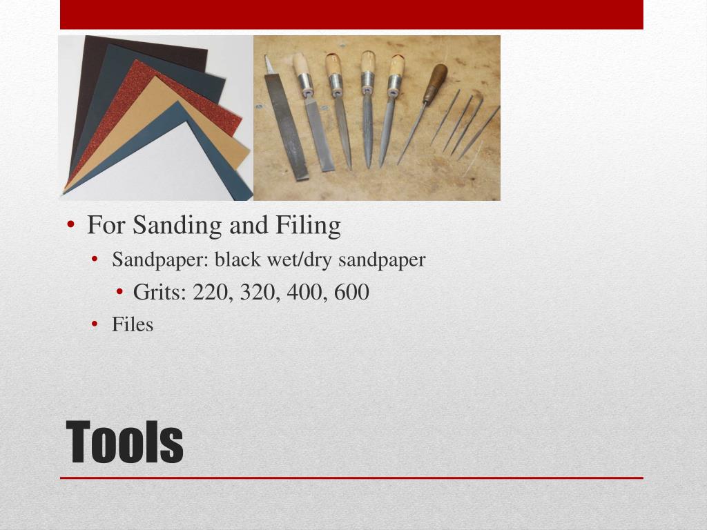 For Sanding and Filing • Sandpaper: black wet/dry sandpaper • Grits: 220, 320, 400, 600 • Files Tools