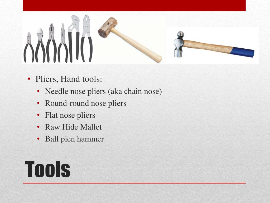 Pliers, Hand tools: • Needle nose pliers (aka chain nose) • Round-round nose pliers • Flat nose pliers • Raw Hide Mallet • Ball pien hammer Tools