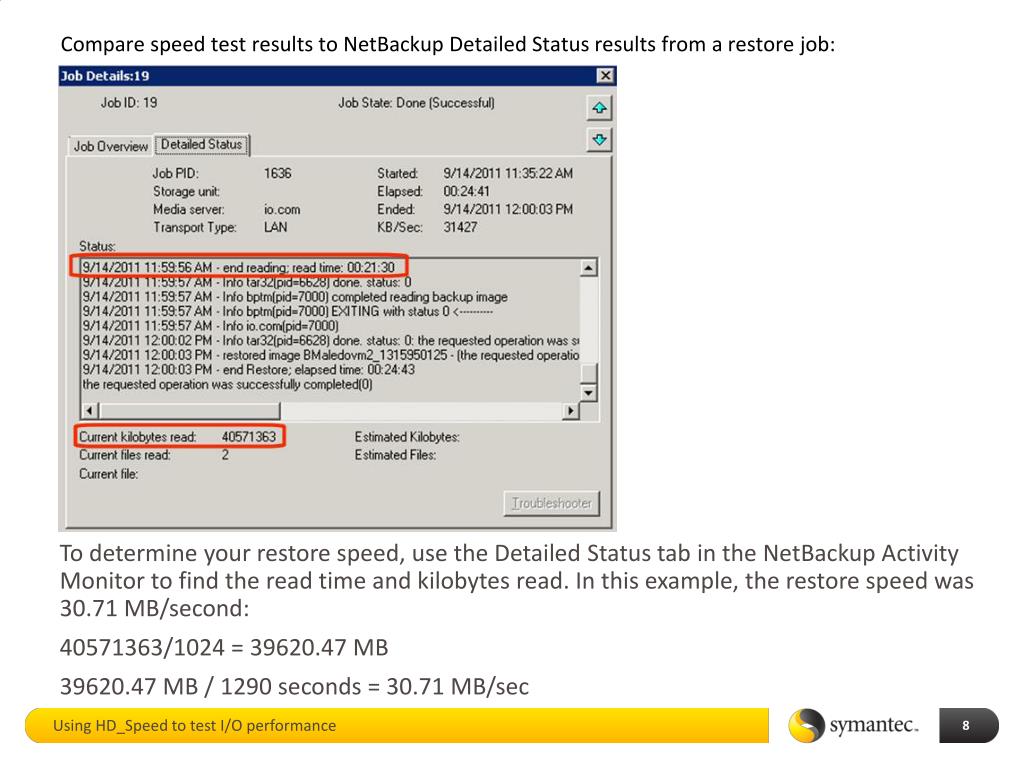 Compare speed test results to NetBackup Detailed Status results from a restore job: To determine your restore speed, use the Detailed Status tab in the NetBackup Activity Monitor to find the read time and kilobytes read. In this example, the restore speed was 30.71 MB/second: 40571363/1024 = 39620.47 MB 39620.47 MB / 1290 seconds = 30.71 MB/sec Using HD_Speed to test I/O performance