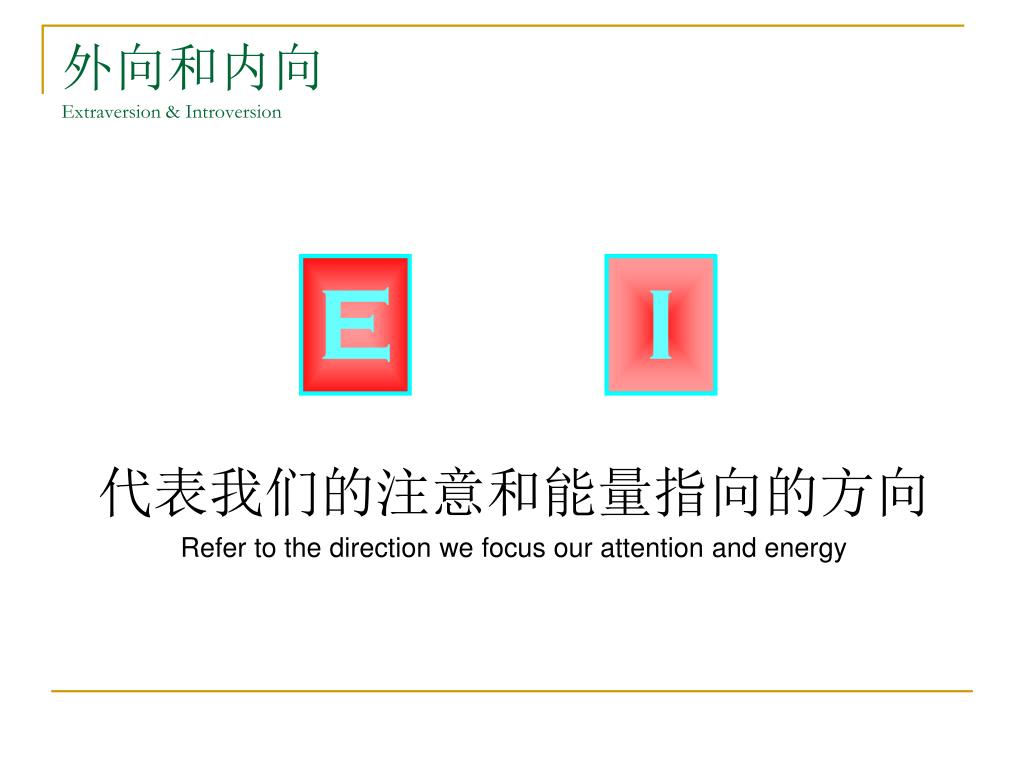 外向和内向Extraversion & Introversion 代表我们的注意和能量指向的方向 Refer to the direction we focus our attention and energy E I