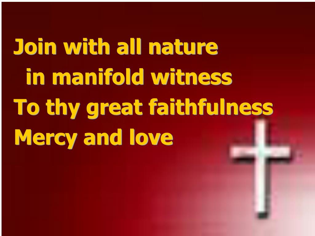 Join with all nature • in manifold witness • To thy great faithfulness • Mercy and love