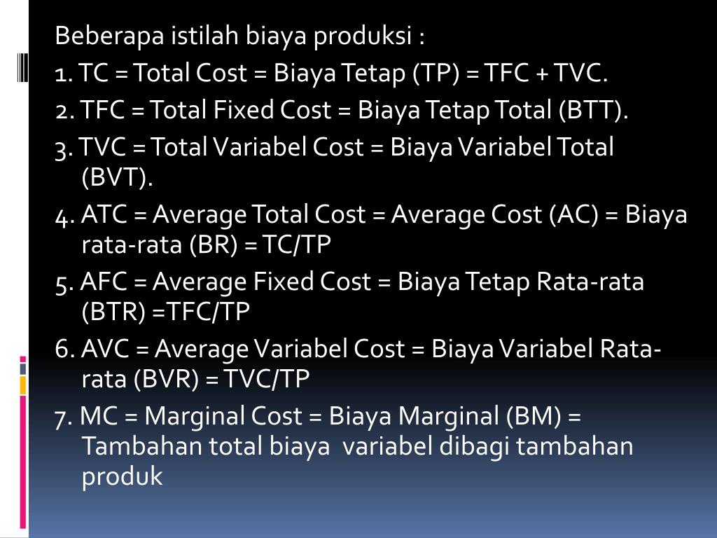 Beberapaistilahbiayaproduksi : 1. TC = Total Cost = BiayaTetap (TP) = TFC + TVC. 2. TFC = Total Fixed Cost = BiayaTetap Total (BTT). 3. TVC = Total Variabel Cost = BiayaVariabel Total (BVT). 4. ATC = Average Total Cost = Average Cost (AC) = Biaya rata-rata (BR) = TC/TP 5. AFC = Average Fixed Cost = BiayaTetap Rata-rata (BTR) =TFC/TP 6. AVC = Average Variabel Cost = BiayaVariabel Rata-rata (BVR) = TVC/TP 7. MC = Marginal Cost = Biaya Marginal (BM) = Tambahan total biayavariabeldibagitambahanproduk