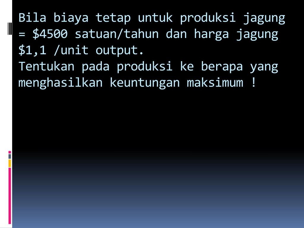 Bilabiayatetapuntukproduksijagung = $4500 satuan/tahundanhargajagung $1,1 /unit output.Tentukanpadaproduksikeberapa yang menghasilkankeuntunganmaksimum !