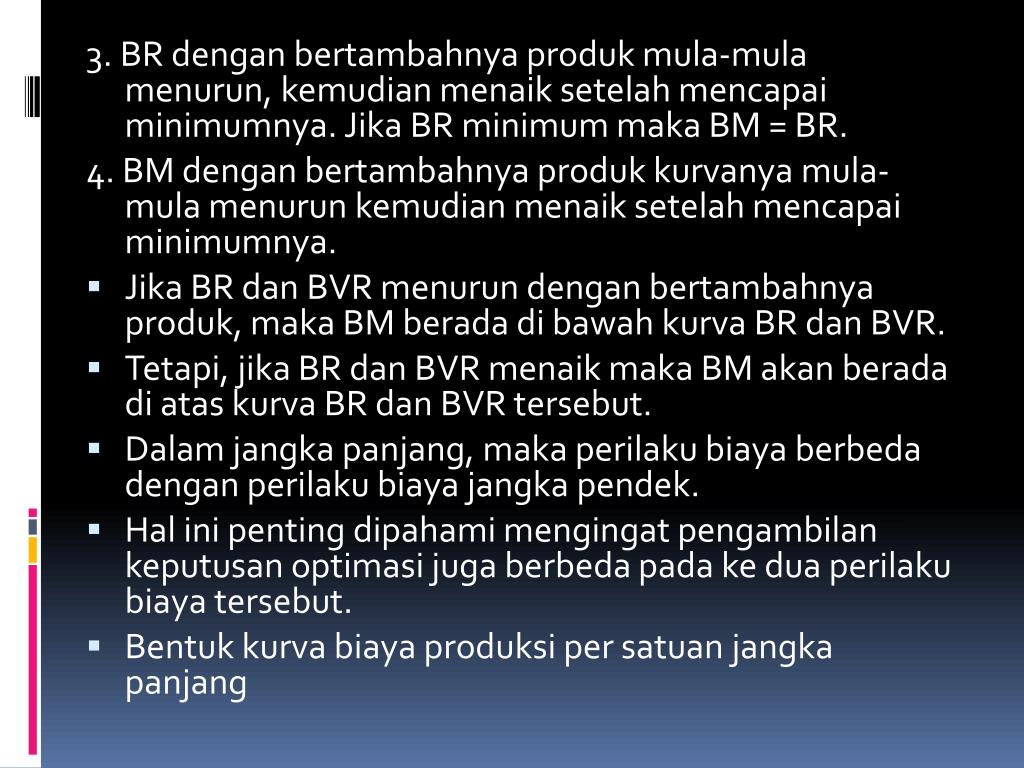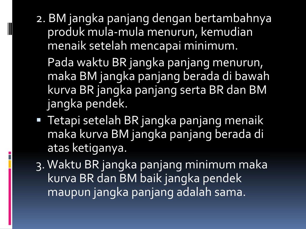 2. BM jangkapanjangdenganbertambahnyaprodukmula-mulamenurun, kemudianmenaiksetelahmencapai minimum. Padawaktu BR jangkapanjangmenurun, maka BM jangkapanjangberadadibawahkurva BR jangkapanjangserta BR dan BM jangkapendek. • Tetapisetelah BR jangkapanjangmenaikmakakurva BM jangkapanjangberadadiatasketiganya. 3. Waktu BR jangkapanjang minimum makakurva BR dan BM baikjangkapendekmaupun jangka panjang adalah sama.