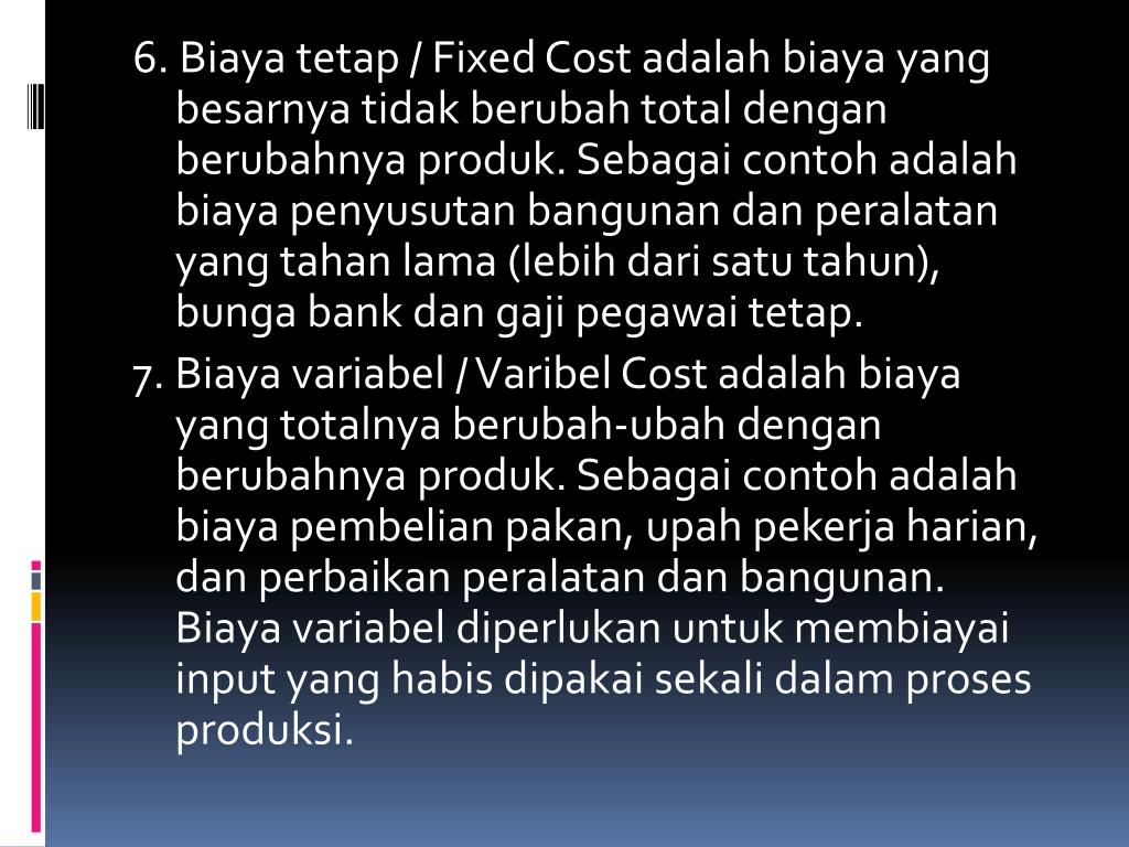 6. Biayatetap / Fixed Cost adalahbiaya yang besarnyatidakberubah total denganberubahnyaproduk. Sebagaicontohadalahbiayapenyusutanbangunandanperalatan yang tahan lama (lebihdarisatutahun), bunga bank dangajipegawaitetap. 7. Biayavariabel / Varibel Cost adalahbiaya yang totalnyaberubah-ubahdenganberubahnyaproduk. Sebagaicontohadalahbiayapembelianpakan, upahpekerjaharian, danperbaikanperalatandanbangunan. Biayavariabeldiperlukanuntukmembiayai input yang habisdipakaisekalidalamprosesproduksi.