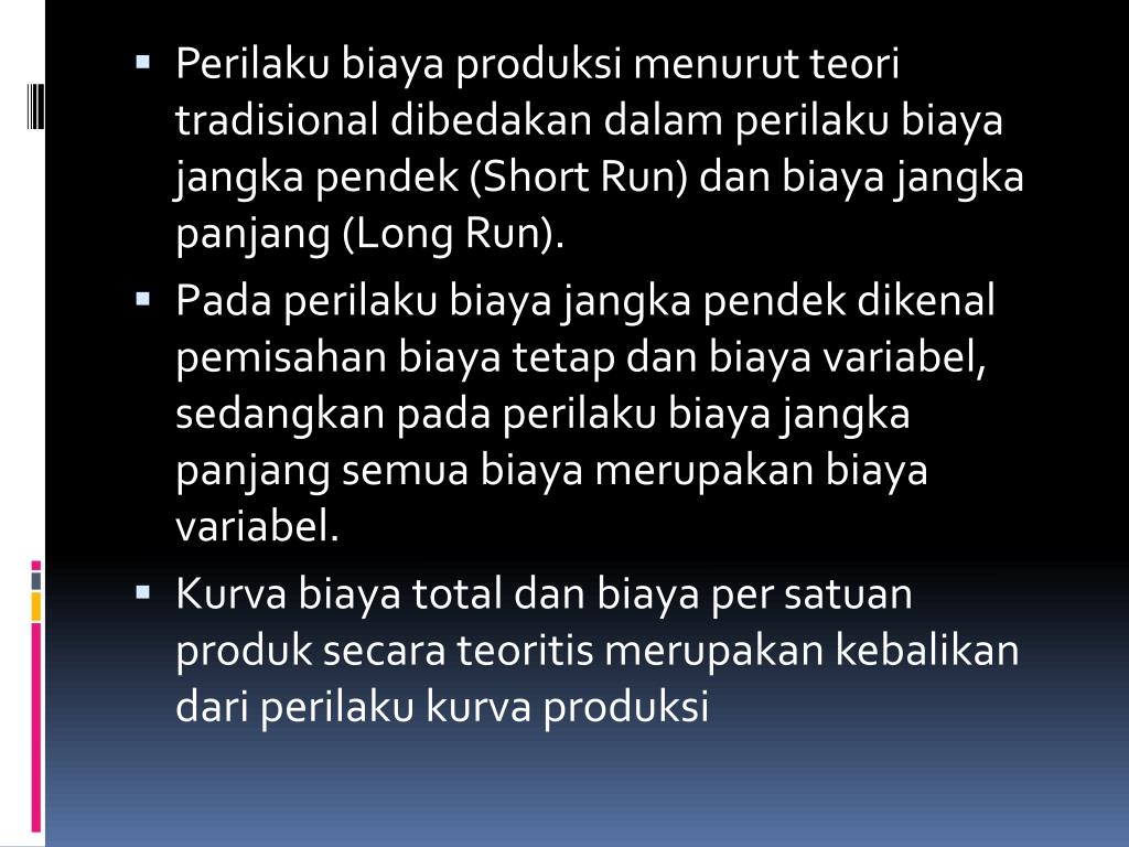 Perilaku biaya produksi menurut teori tradisional dibedakan dalam perilaku biaya jangka pendek (Short Run) dan biaya jangka panjang (Long Run). • Pada perilaku biaya jangka pendek dikenal pemisahan biaya tetap dan biaya variabel, sedangkan pada perilaku biaya jangka panjang semua biaya merupakan biaya variabel. • Kurva biaya total dan biaya per satuan produk secara teoritis merupakan kebalikan dari perilaku kurva produksi
