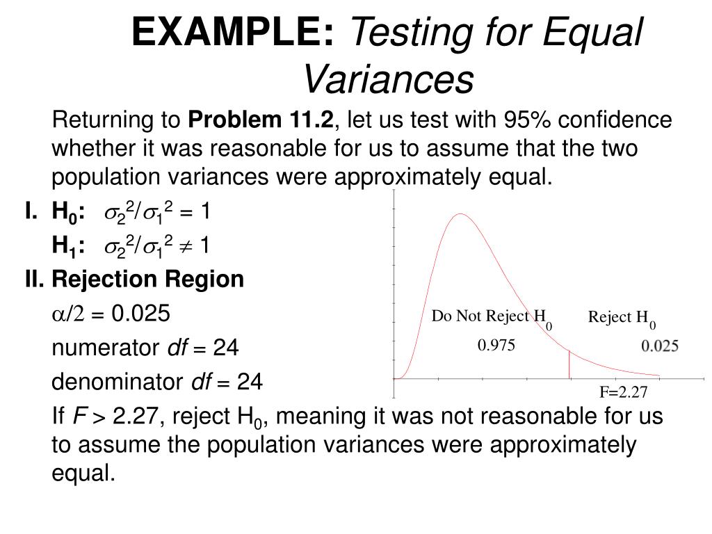 EXAMPLE:Testing for Equal Variances Returning to Problem 11.2, let us test with 95% confidence whether it was reasonable for us to assume that the two population variances were approximately equal. I.H0:s22/s12 = 1 H1:s22/s12¹ 1 II. Rejection Region a/2 = 0.025 numerator df = 24 denominator df = 24 If F > 2.27, reject H0, meaning it was not reasonable for us to assume the population variances were approximately equal.