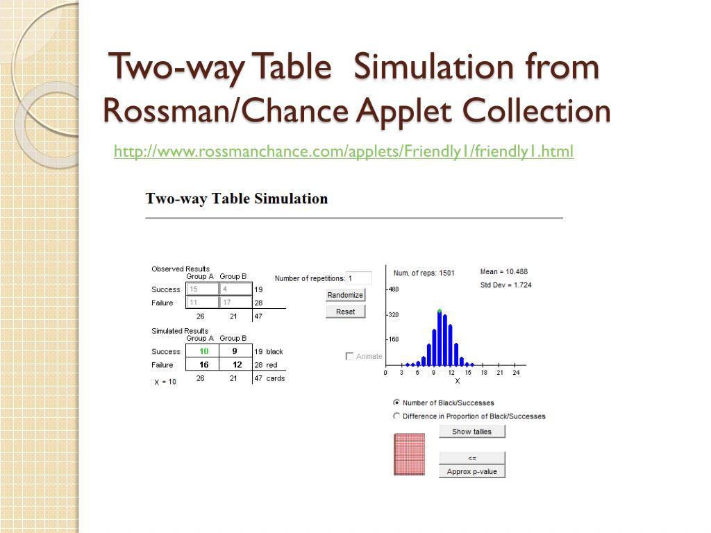 Two-way Table Simulation from Rossman/Chance Applet Collection http://www.rossmanchance.com/applets/Friendly1/friendly1.html