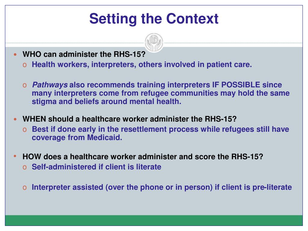 Setting the Context WHO can administer the RHS-15? Health workers, interpreters, others involved in patient care. Pathways also recommends training interpreters IF POSSIBLE since many interpreters come from refugee communities may hold the same stigma and beliefs around mental health. WHEN should a healthcare worker administer the RHS-15? Best if done early in the resettlement process while refugees still have coverage from Medicaid. HOW does a healthcare worker administer and score the RHS-15? Self-administered if client is literate Interpreter assisted (over the phone or in person) if client is pre-literate