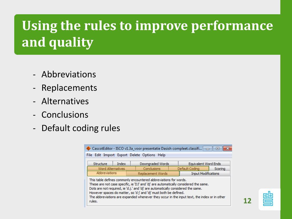 Using the rules to improve performance and quality • Abbreviations • Replacements • Alternatives • Conclusions • Default codingrules
