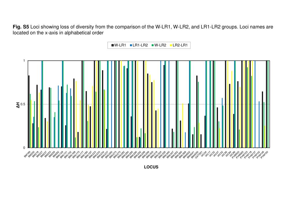 Fig. S5 Loci showing loss of diversity from the comparison of the W-LR1, W-LR2, and LR1-LR2 groups. Loci names are located on the x-axis in alphabetical order.
