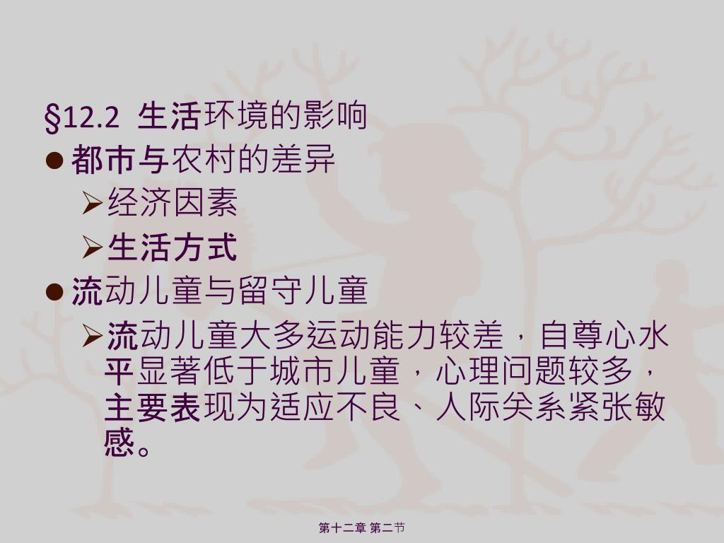 §12.2 生活环境的影响 • 都市与农村的差异 • 经济因素 • 生活方式 • 流动儿童与留守儿童 • 流动儿童大多运动能力较差,自尊心水平显著低于城市儿童,心理问题较多,主要表现为适应不良、人际关系紧张敏感。 第十二章 第二节