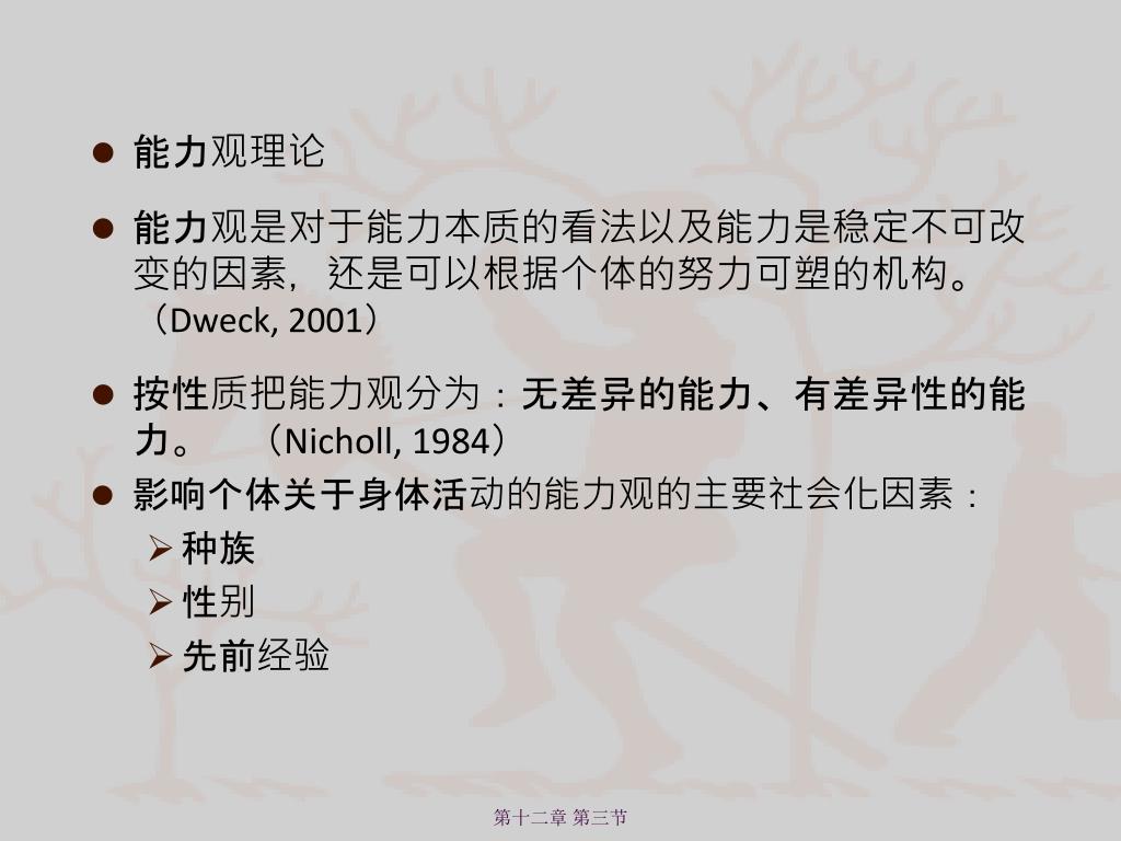 能力观理论 • 能力观是对于能力本质的看法以及能力是稳定不可改变的因素,还是可以根据个体的努力可塑的机构。(Dweck, 2001) • 按性质把能力观分为:无差异的能力、有差异性的能力。 (Nicholl, 1984) • 影响个体关于身体活动的能力观的主要社会化因素: • 种族 • 性别 • 先前经验 第十二章 第三节