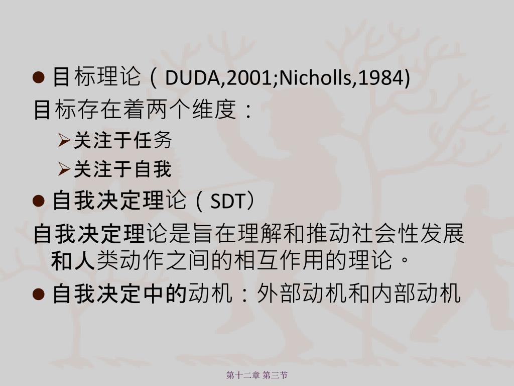 目标理论(DUDA,2001;Nicholls,1984) 目标存在着两个维度: • 关注于任务 • 关注于自我 • 自我决定理论(SDT) 自我决定理论是旨在理解和推动社会性发展和人类动作之间的相互作用的理论。 • 自我决定中的动机:外部动机和内部动机 第十二章 第三节