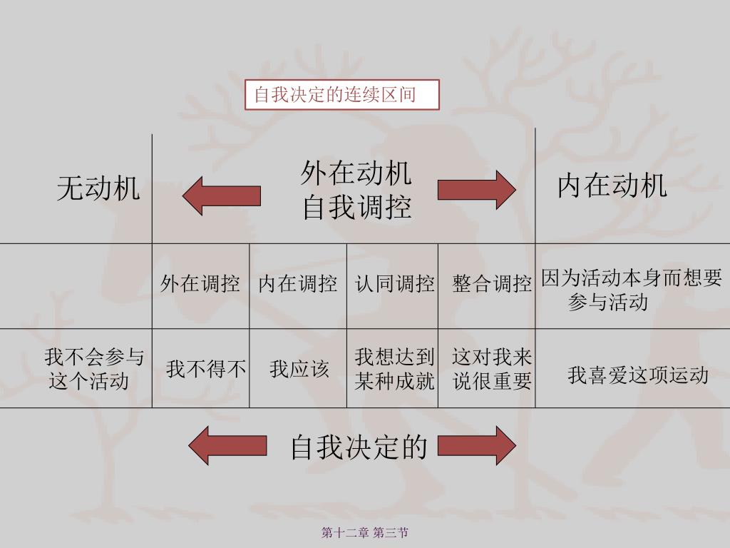 自我决定的连续区间 外在动机 自我调控 内在动机 无动机 因为活动本身而想要 参与活动 外在调控 内在调控 认同调控 整合调控 我不会参与 这个活动 我想达到 某种成就 这对我来 说很重要 我不得不 我应该 我喜爱这项运动 自我决定的 第十二章 第三节