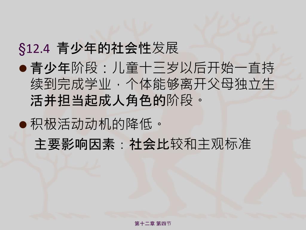 §12.4 青少年的社会性发展 • 青少年阶段:儿童十三岁以后开始一直持续到完成学业,个体能够离开父母独立生活并担当起成人角色的阶段。 • 积极活动动机的降低。 主要影响因素:社会比较和主观标准 第十二章 第四节